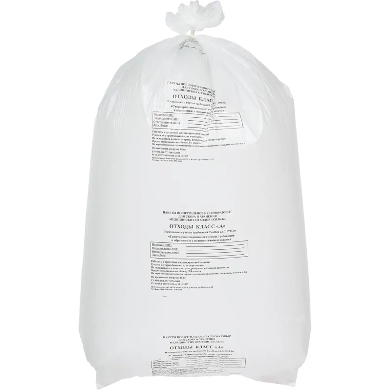 Пакет для мед.отходов кл.А белый 700х800х13мкм, 60л, 500 шт/уп, ПТП Киль