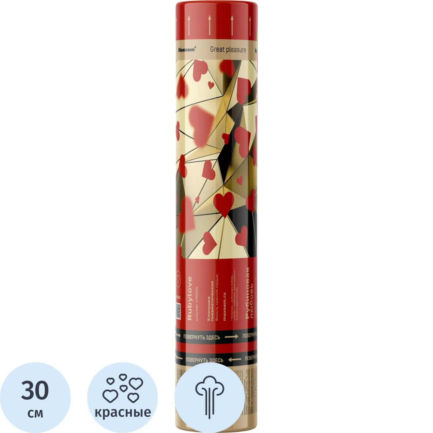 Хлопушка пневматическая 30см конфетти-сердца из фольги красный CM001