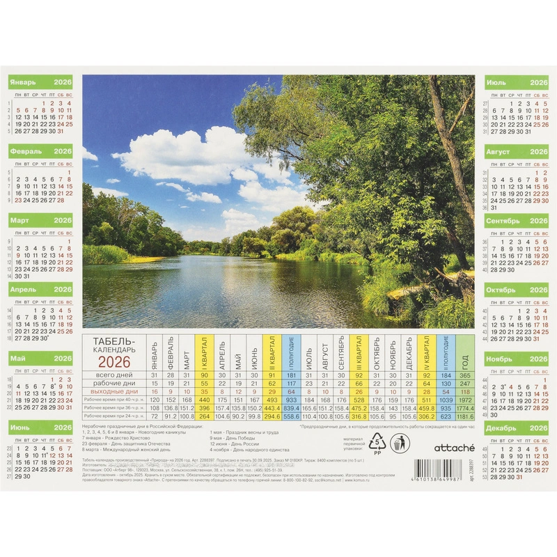 Календарь листовой 2026,Табель произв.Природа,мел.карт.,220х290,5шт/уп