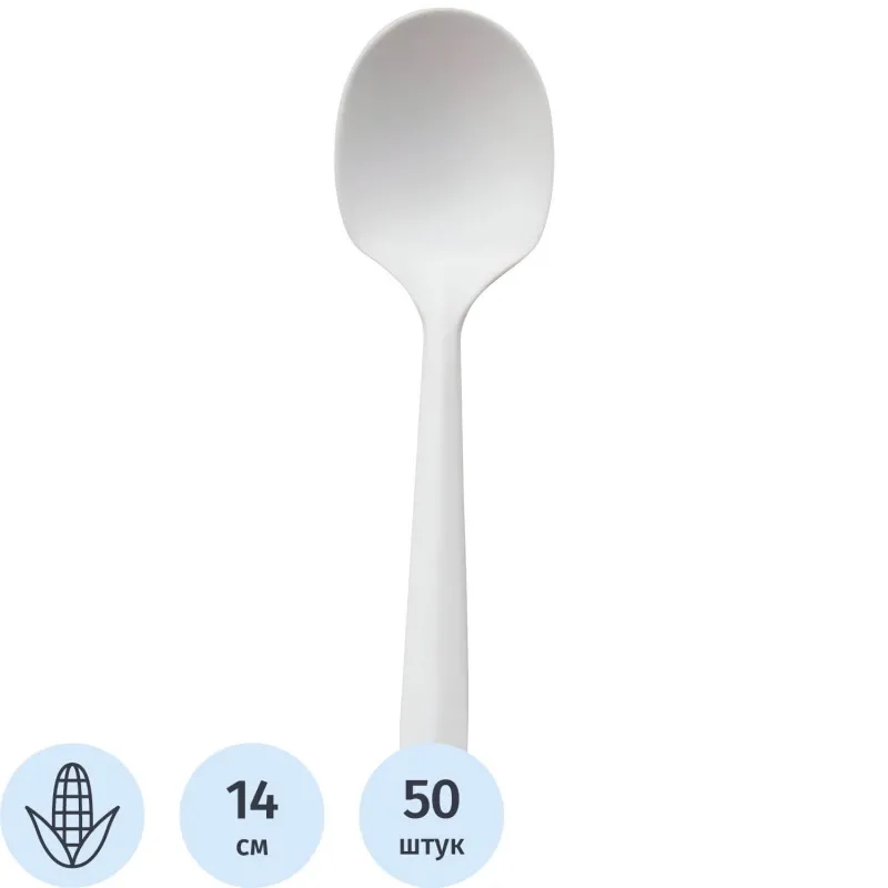 Ложка одноразовая 140 мм, бел.,кукурузный крахмал, 50 шт/уп GREEN MYSTERY