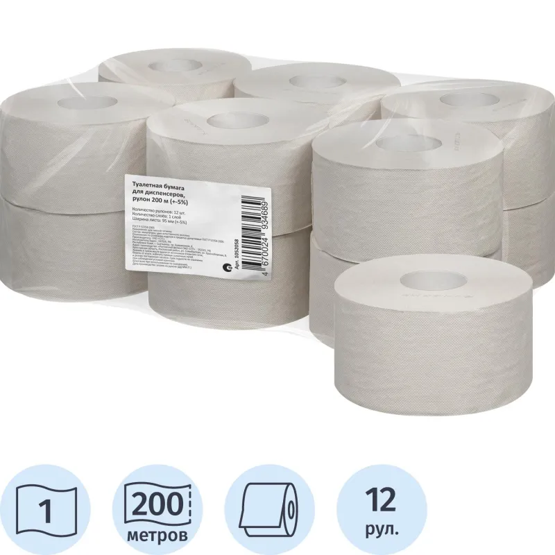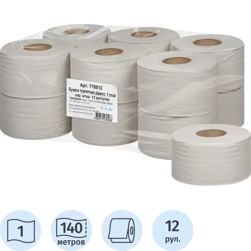 Бумага туалетная д/дисп 1сл сер втор 200ф 12рул/уп 0024А