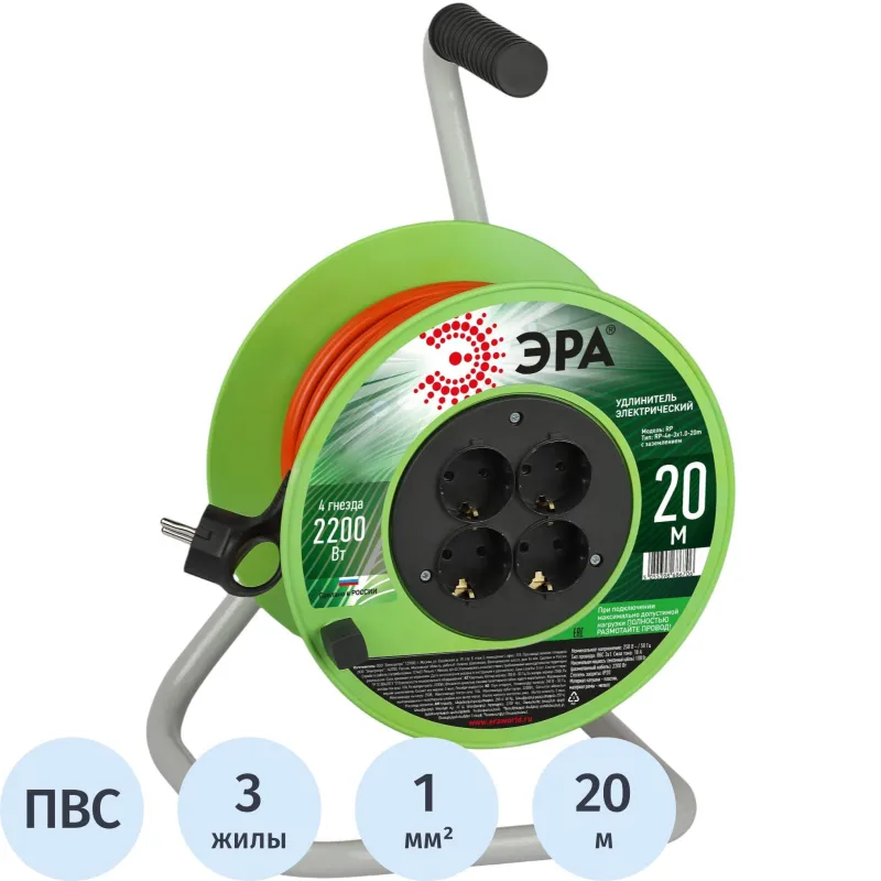 Удлинитель силовой ЭРА ПВС 3х1мм2 20м на пласт.кат. c/з 4 розетки,Б0056098