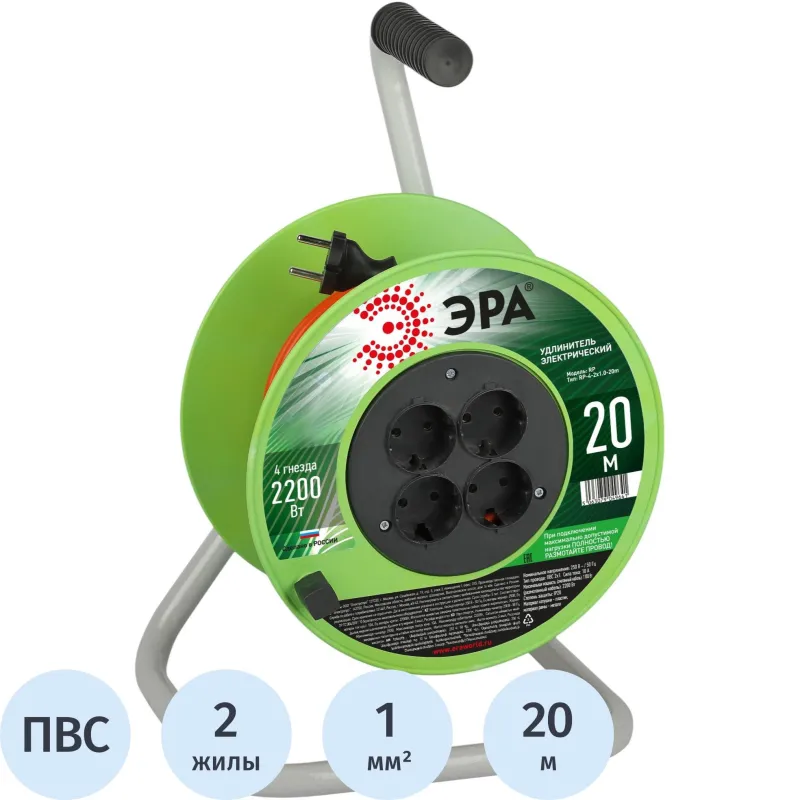 Удлинитель силовой ЭРА ПВС 2х1мм2 20м на пласт.кат. б/з 4 роз.,Б0059781