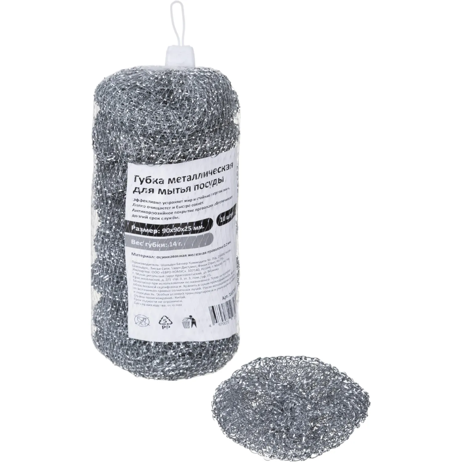 Губка-мочалка металлическая для мытья посуды 90х90x25мм 14г 10шт/уп