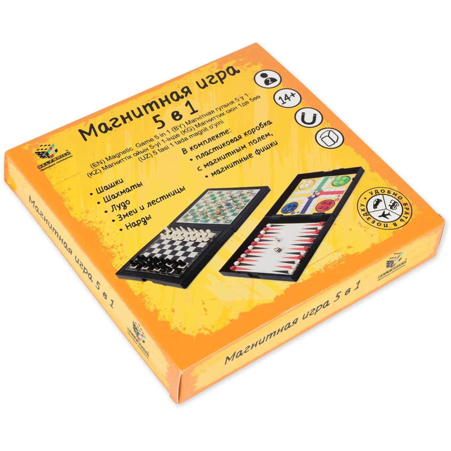 Игра настольная (магн.) 5в1 Шашки, шахматы, лудо, змеи и лестницы, нарды