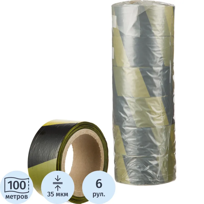 Лента оградительная желто-черная 50мм х100м, 6шт/уп