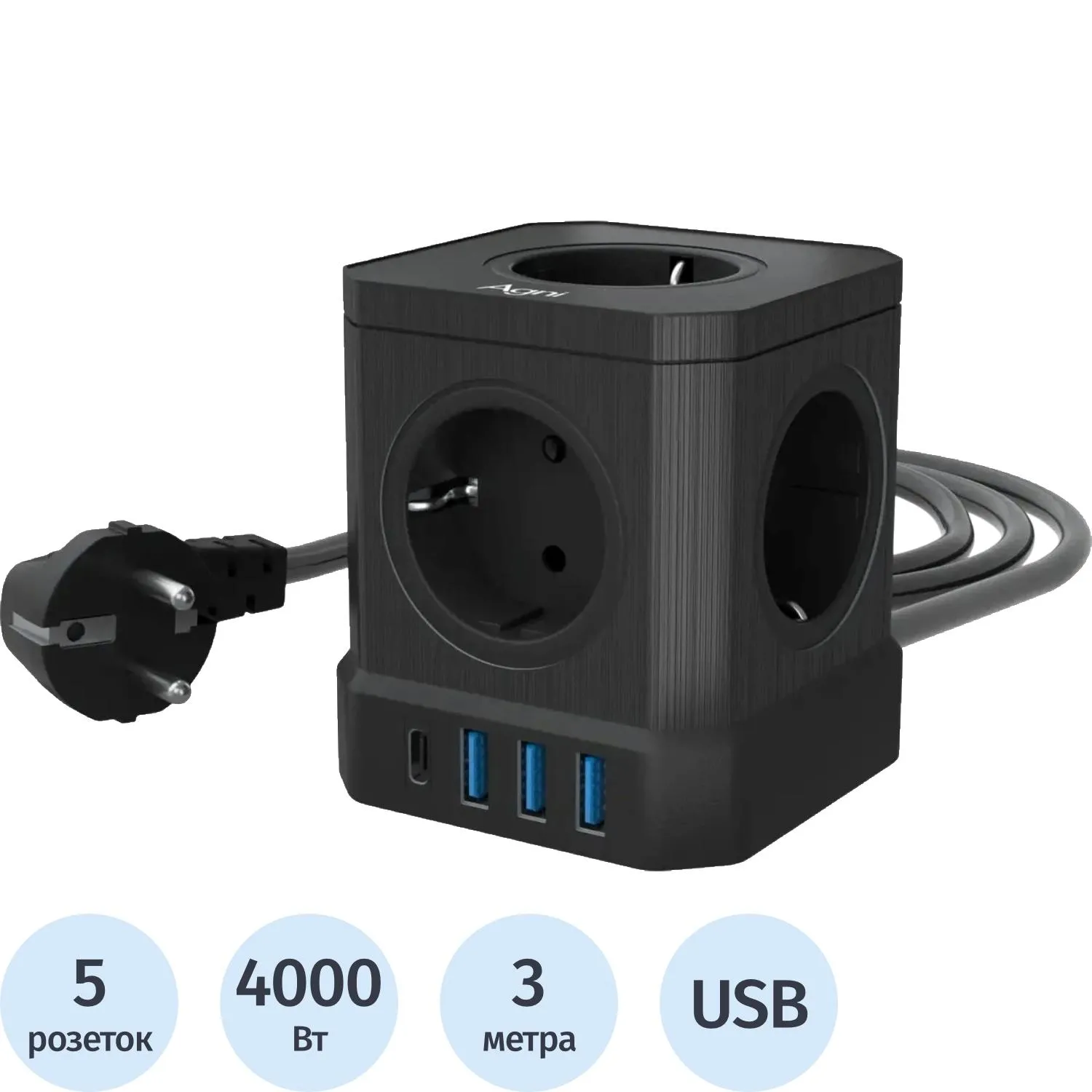 Сетевой фильтр AGNI 5р/3м,3USB 1TYPE-C,черный(TP-VE4U5E-C-3m-black)