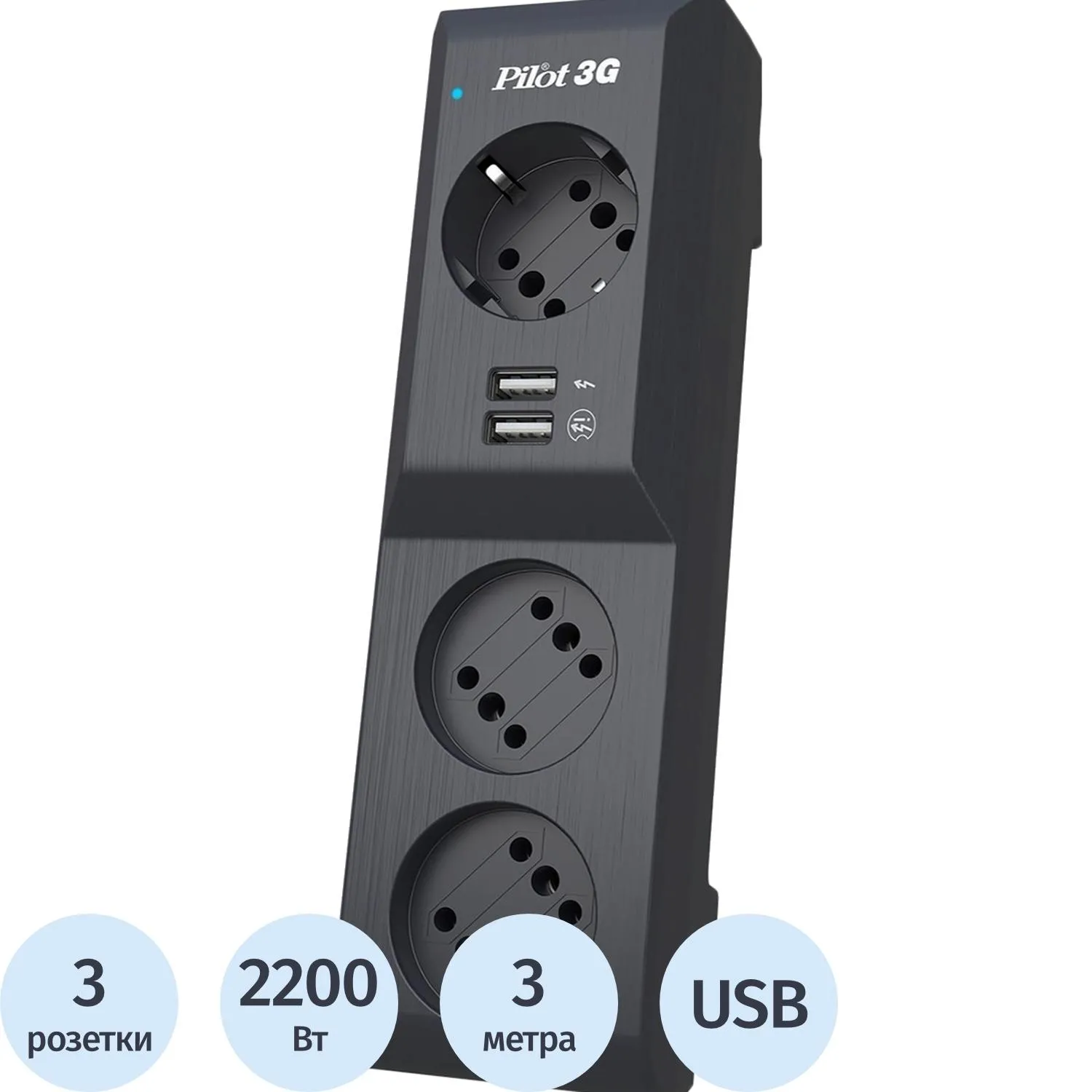 Сетевой фильтр PILOT 3G (3 евро+2 USB/3м/10А/150Дж/черный)