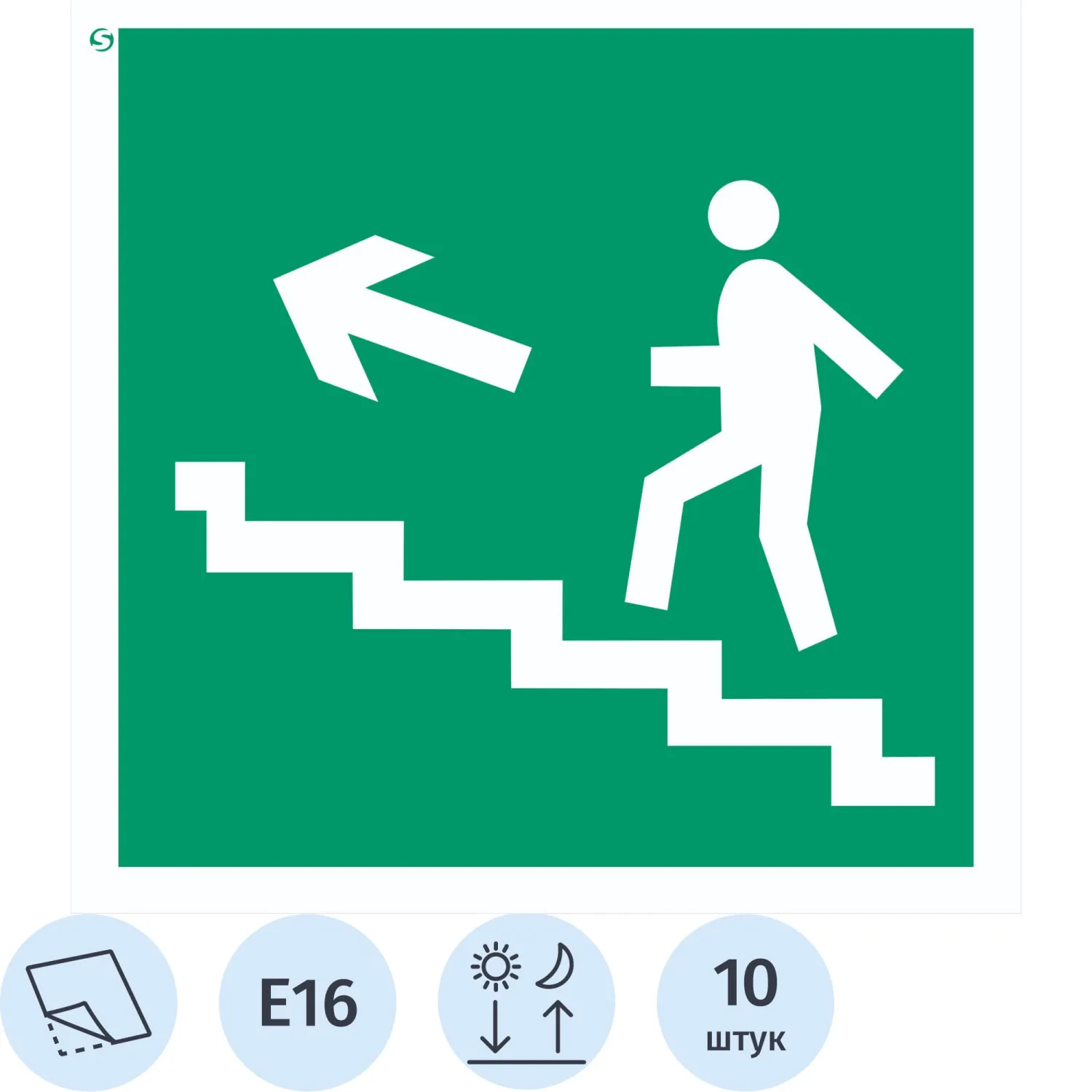 Знак безопасности E16 Напр.к эв.вых.по лест.ввер/лев(ф/л,200х200)10шт/уп,пл