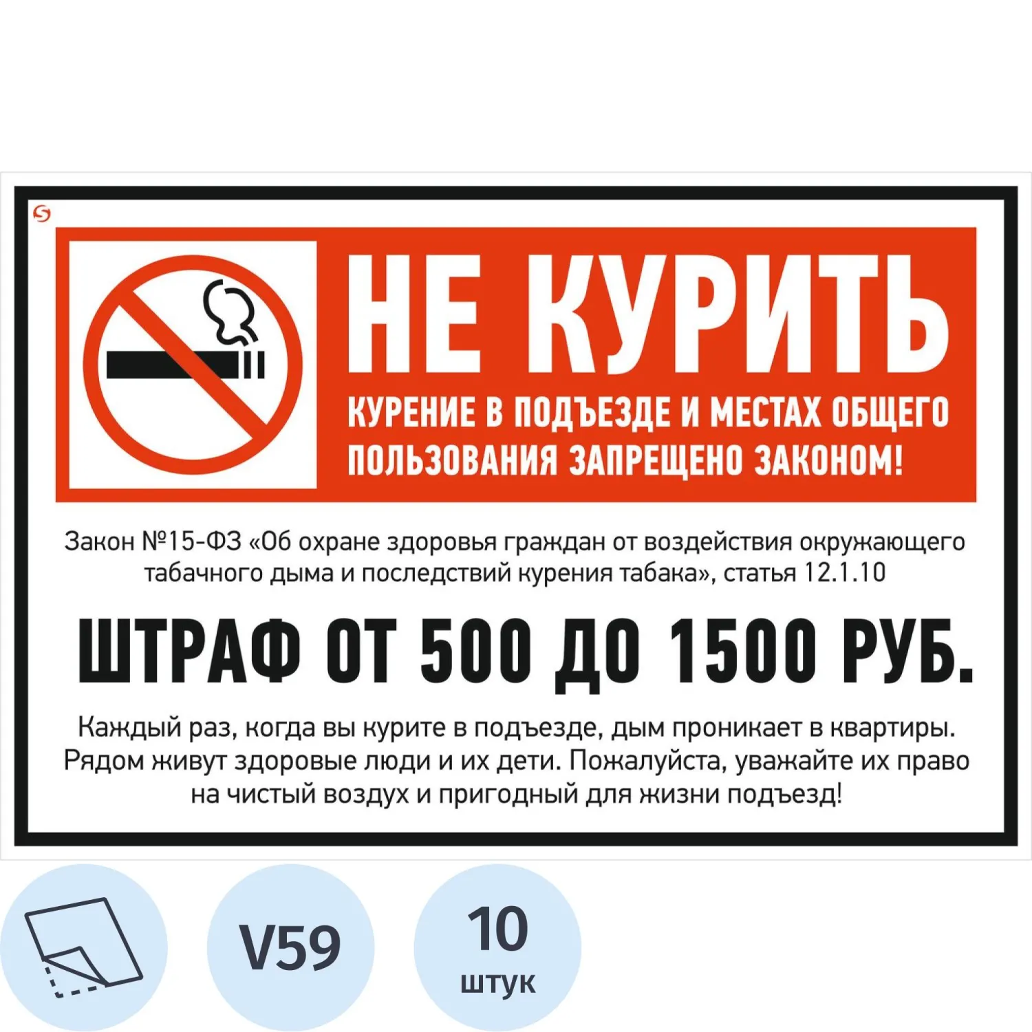Знак безопасности V59 Не курить (штраф), 200x300 мм, пленка,10шт/уп