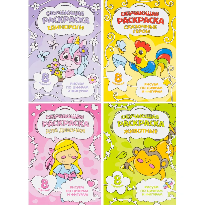 Раскраска обучающие по цифрам и фигурам 4шт/уп. Для девочек