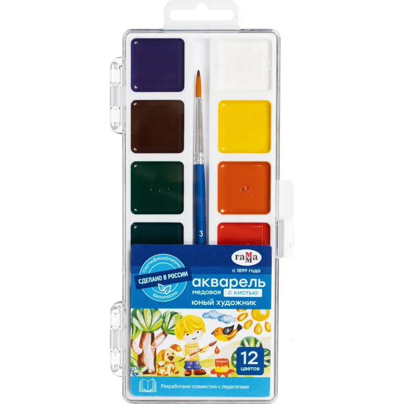 Детская акварель абсолютно безопасна для здоровья, так как производится из экологически чистых материалов (мед, глицерин). Поэтому даже полуторогодовалый малыш может с ее помощью смело развивать свои творческие способности под вашим присмотром. Благодаря работе с кисточкой, малыш гораздо быстрее научится справляться с ложкой за столом и пуговицами на его одежде. А у вас есть отличная возможность наблюдать, как ребенок удивляется и радуется, создавая новые оттенки в процессе смешивания красок разных цветов.