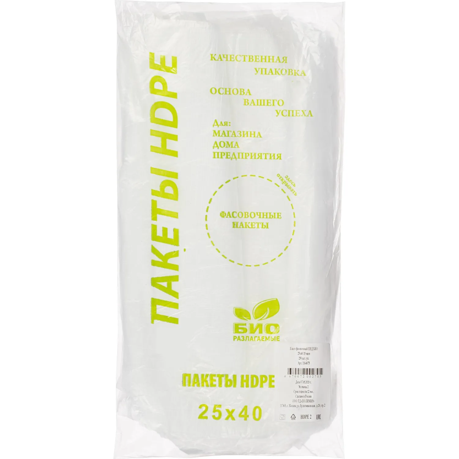 Пакет фасовочный ПНД БИО 25х40 15мкм 250шт /уп